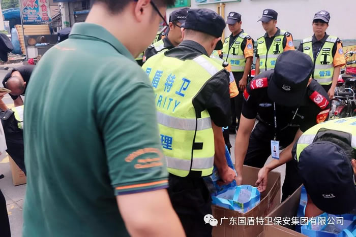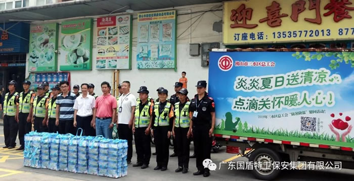 2019年8月23日上午,三水區(qū)總工會(huì)副主席鄺剛?cè)?、辦公室主任駱永鋒以及三水區(qū)云東海街道總工會(huì)專職副主席林斌攜工會(huì)工作人員蒞臨國(guó)盾特衛(wèi)保安集團(tuán)總部,為辛勤奮斗在高溫執(zhí)勤一線的保安員代表送上了一批清涼飲料等慰問品,送來了深切祝福和關(guān)懷。