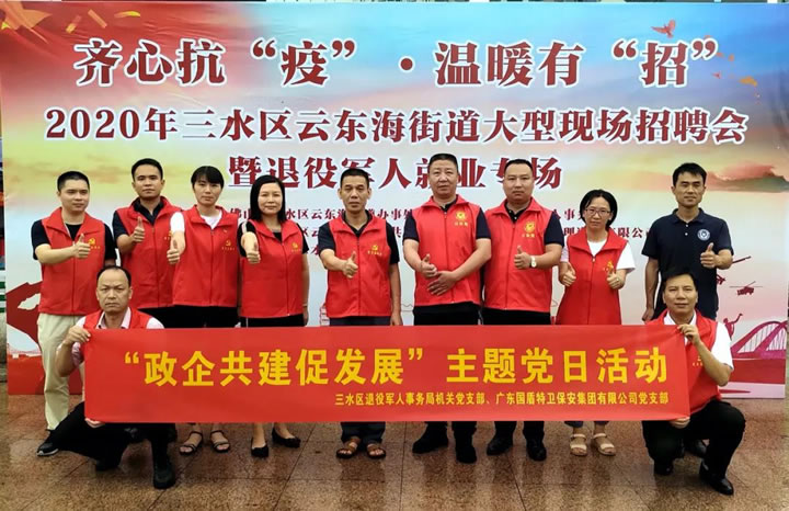 為貫徹落實(shí)上級(jí)有關(guān)部門(mén)的決策部署,強(qiáng)化黨組織之間的交流合作,把“政企共建促發(fā)展”的工作落到實(shí)處,促進(jìn)資源共享、優(yōu)勢(shì)互補(bǔ),助推退役軍人就業(yè)創(chuàng)業(yè),進(jìn)一步搭建退役軍人與企業(yè)的雙向交流平臺(tái)。9月19日當(dāng)天,三水區(qū)退役軍人事務(wù)局黨支部、廣東國(guó)盾特衛(wèi)保安集團(tuán)有限公司黨支部在三水萬(wàn)達(dá)廣場(chǎng)開(kāi)展合作共建主題黨日活動(dòng)暨舉辦退役軍人專場(chǎng)招聘會(huì)。
