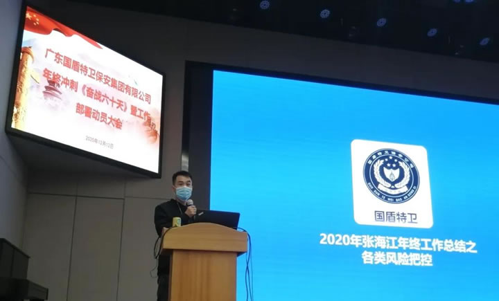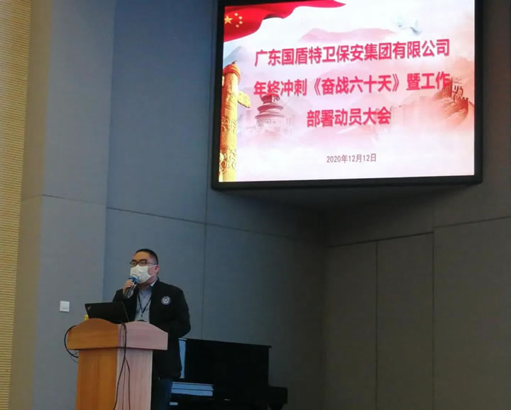 為了確保年末各項工作順利開展,規避各類安全風險事故,夯實基礎管理力量,抓住集團公司發展的重要戰略機遇時期,把客戶安全貫穿到集團公司工作各方面。堅持系統思維,構建大安全格局,全面塑造“國盾特衛”品牌,鑄造一支“素質過硬、服務一流”的精兵強隊,進一步提升客戶單位的服務水平和滿意度,促進集團公司品牌形象建設和可持續健康發展,為客戶單位提供堅強的安全服務保障。 12月12日,集團公司召開隊伍管理年終總結暨年終沖刺奮戰六十天動員大會,集團公司副總經理兼發展管理部部長王延周、服務管理部部長高永旗、行政人事部副部長白雪瑩、各保安部經理、大隊長、分隊長列席會議。