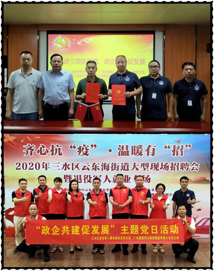 為進一步構建愛國擁軍平臺,凝聚社會民間資源,集團公司黨支部書記、董事長夏學樹聯合區退役軍人事務局推動成立三水區愛國擁軍促進會。公司注重黨員、退役軍人人才的引進和培育,與時俱進深化軍民關系,以黨建引領企業高質量發展。為了響應黨和政府“擁軍優屬,擁政愛民”的號召,今年新錄用的管理層人員大多數為退役軍人,其中有4名為中共黨員。一直以來,集團公司致力推進融合式黨建工作,將企業文化融入愛國主義和革命傳統教育,匯聚紅色力量,激發保安員的愛國熱情,增強新時代責任擔當,確保每年發展1-2名黨員,不斷充實企業發展和黨組織力量。
