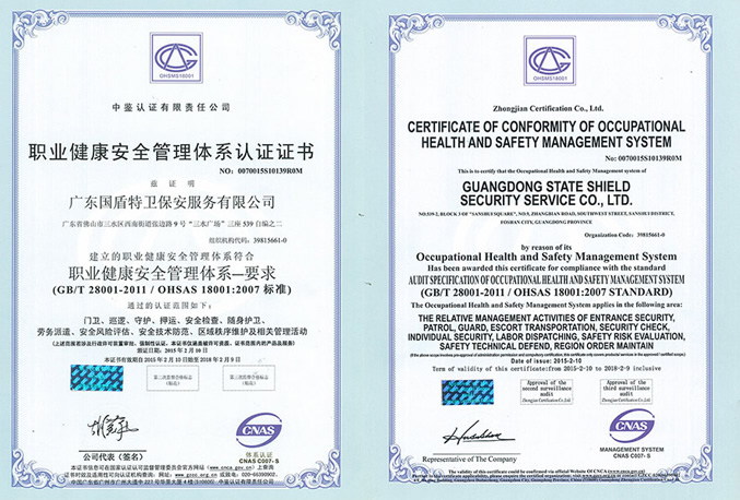 職業健康安全管理體系認證證書
